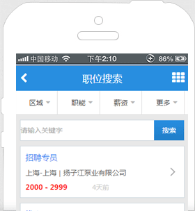 - 无需下载,不占手机空间,超省流量,没有机型的限制,有触屏手机就能上网找工作机会不再稍纵即逝,它已在你轻盈的指尖上